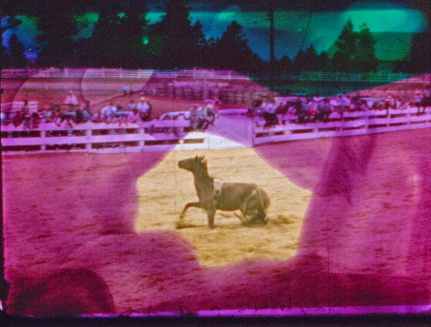 Split Horizon is an optically printed 16mm impressionistic handmade film. Using found home movies and travel films from the 1960s, I respond to the material through collage, painting and abstraction directly onto film, aiming to create a psychological traversal across a vast unknown. Landscape acts as a basis for exploration, and characters emerge and descend, representing the self or the other. The onscreen horizon is often literally split; the characters and places become a mirror for one another, meditating on our own ability to contain multiple versions of self, identity and internal narratives about our own stories, paths and histories.